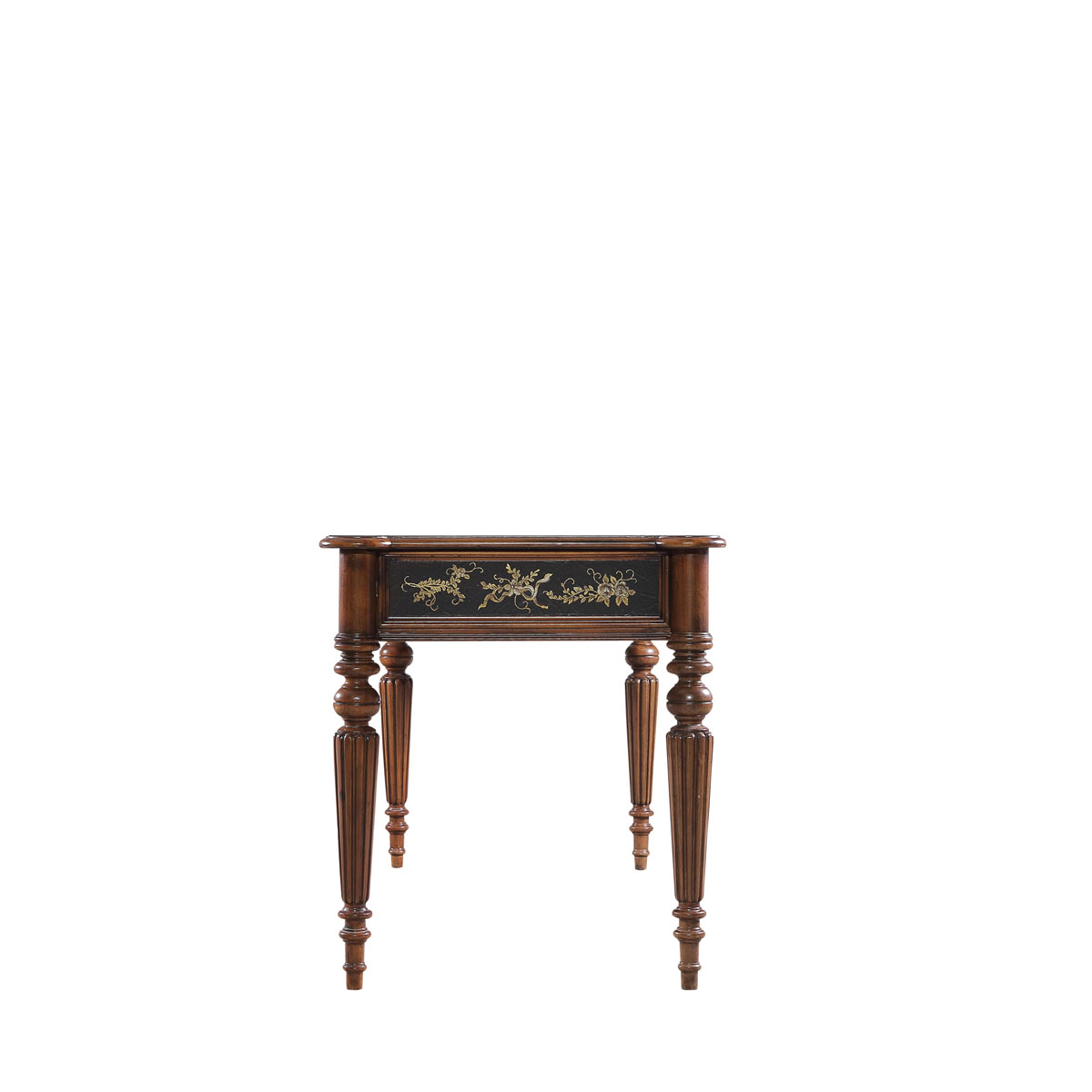 * 以18世纪英吉利——“日不落帝国”为设计主题,将东西方的多种艺术元素结合在一起。精致的木皮贴面,展现了高档木材的天然纹理,带出独特的立体感;黑底金漆的山水手绘,颇具东方情调。配上Sheraton(谢拉顿风格)的锥形凹槽柱和层板设计,是经典系列英吉利经典英式长方咖啡桌的特色。