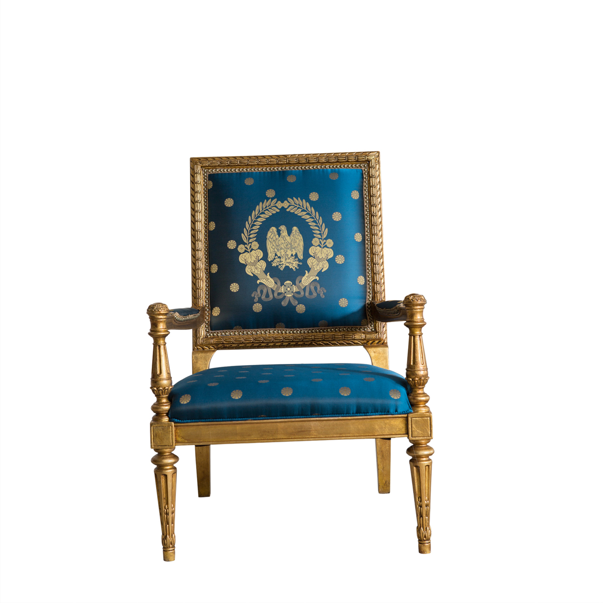 * 这是以美国白宫的Blue Room(蓝色房间) 为意念并结合法国元素而设计的沙发。包括建筑雕刻锥形脚、 权杖状的扶手柱、叶形雕刻外框和贴金铂工艺,配上代表自由的蓝色布艺和包有丰厚的填充物坐垫和靠背。