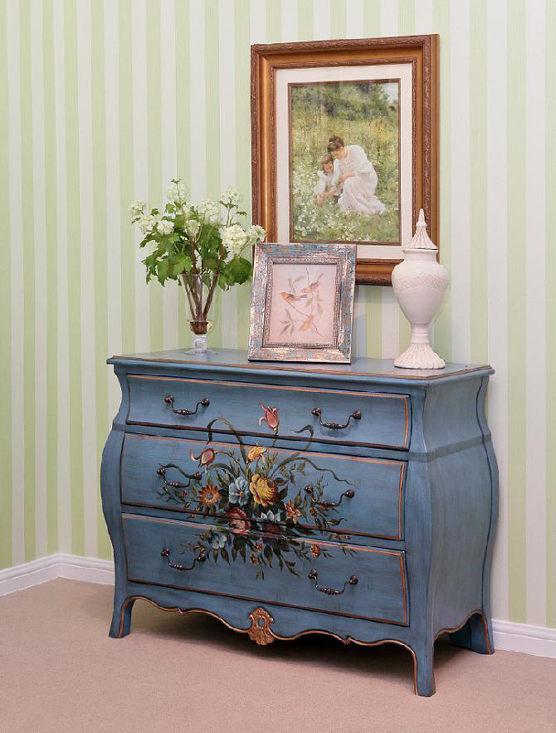 手绘即在法式家具上作画,据说起源于13、14世纪的法国,后演变为欧式家具的代表性表现形式。在法式休闲家具领域,手绘图案多为花草、植物等,线条细腻,色泽素净,以突显浪漫怡人的艺术效果。