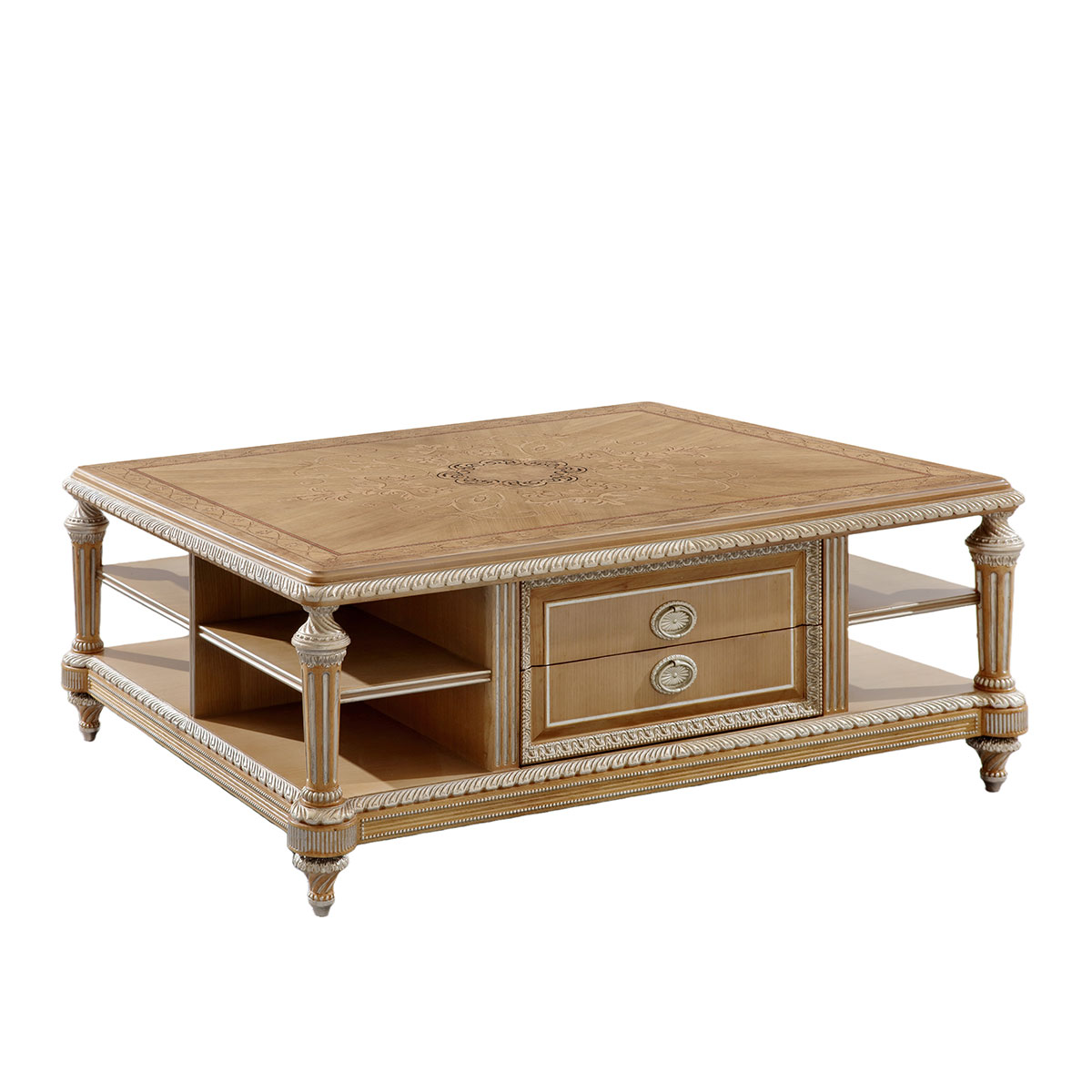 手工木皮拼贴工艺结实的连接技术18道以上的多步骤油漆工艺 * 两个储物抽斗,底部采用实木硬木滑轨 * 可拆装设计。 * 底部装有可调整脚钉。