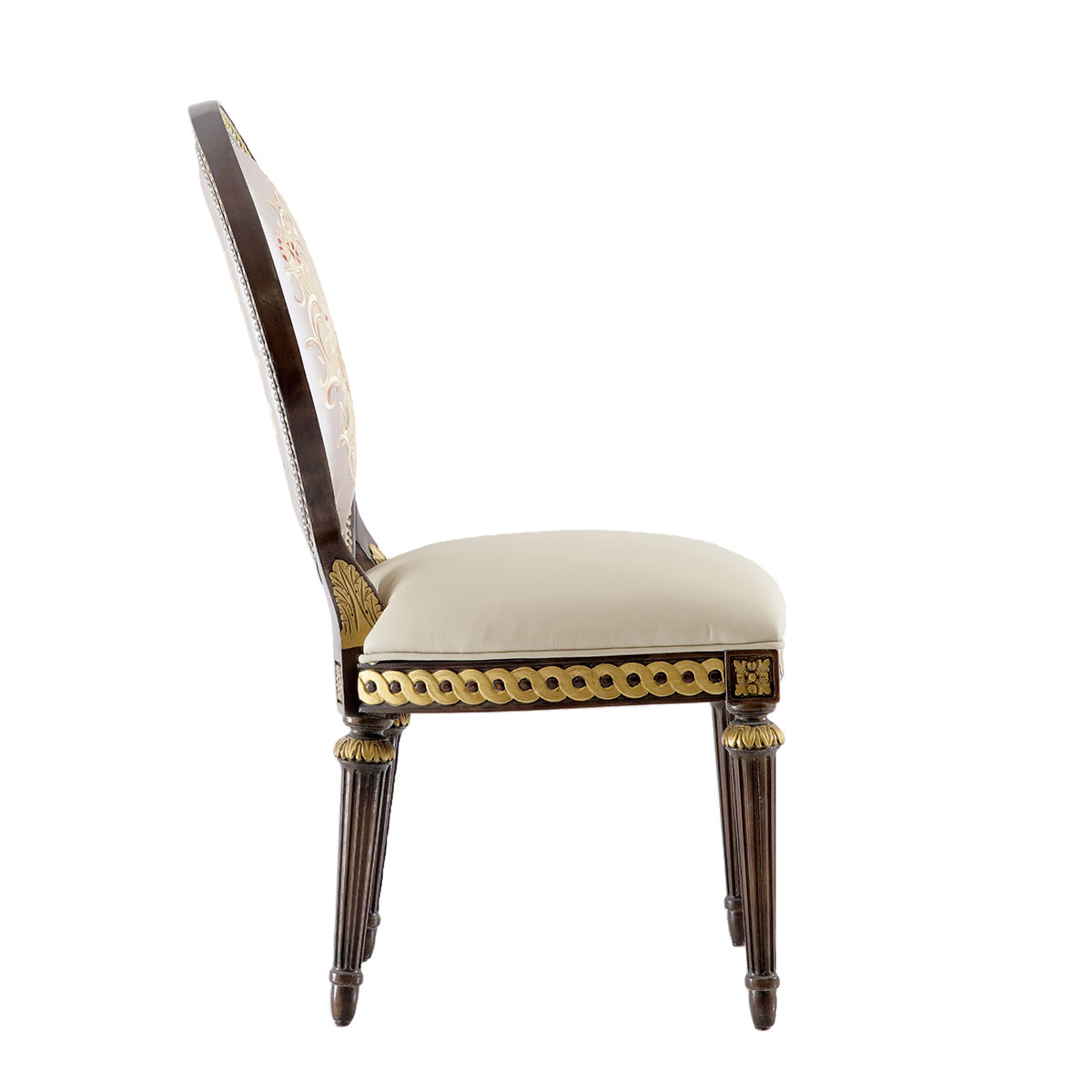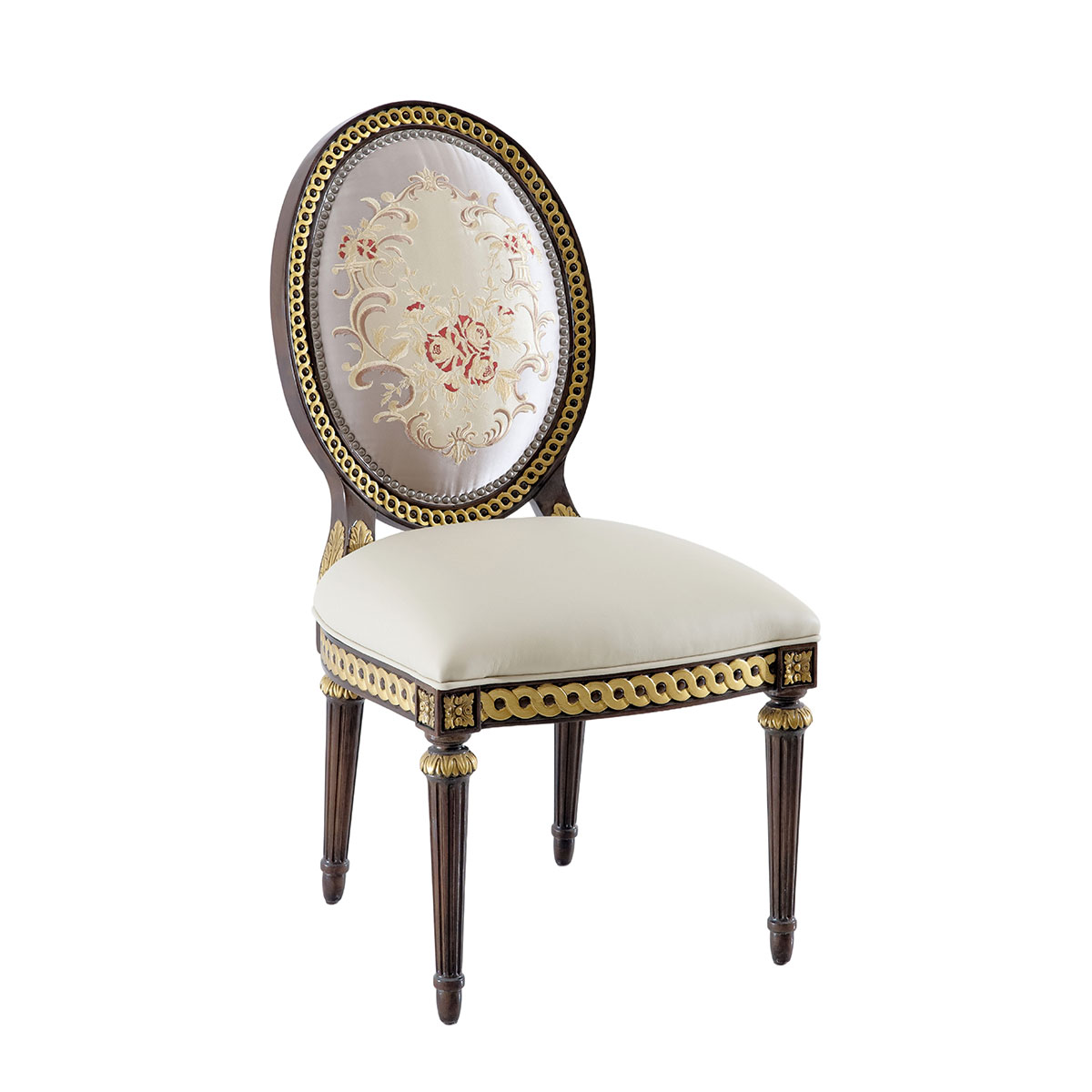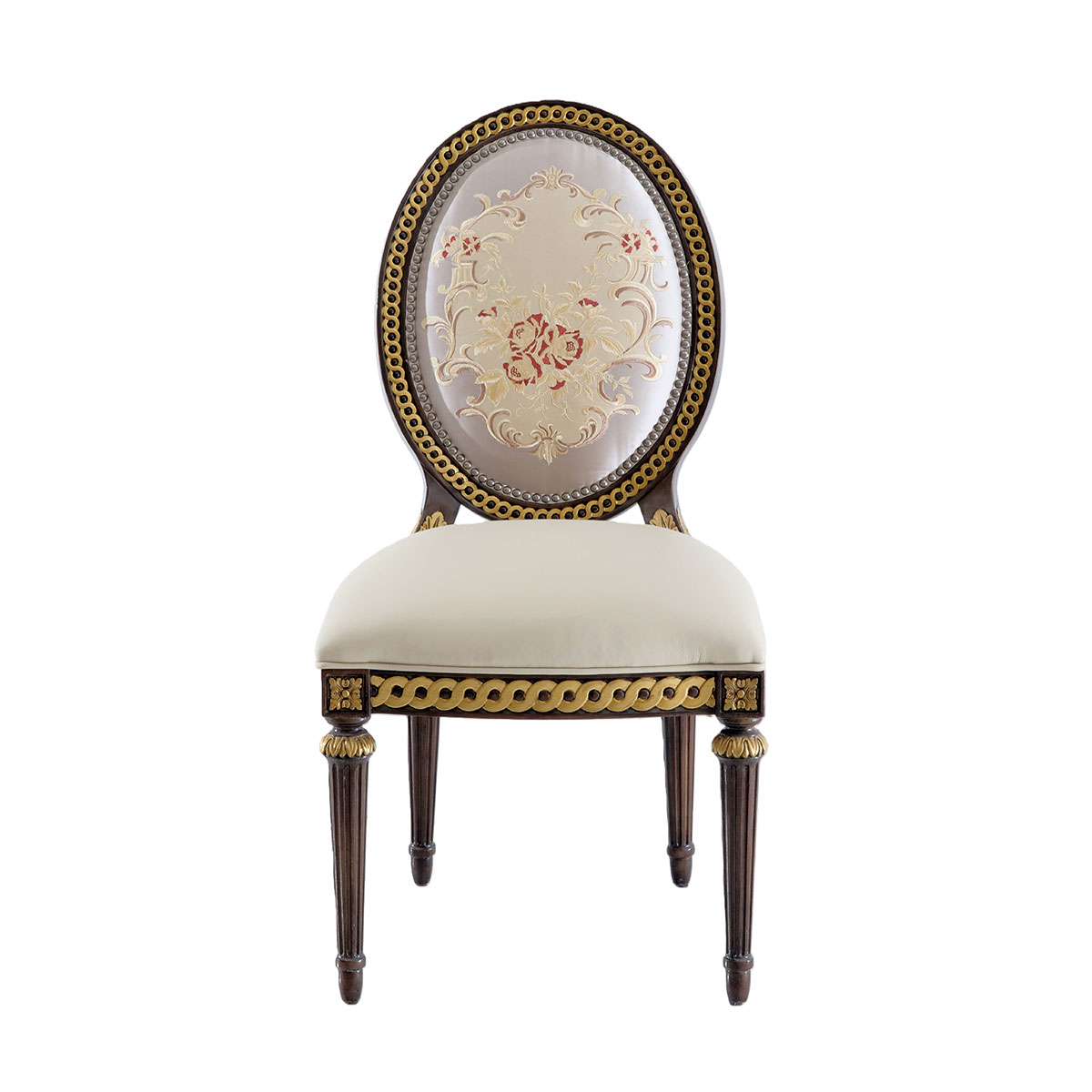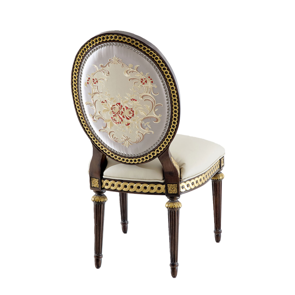 参考18世纪法国路易十六时期涂金扶手椅古董设计,并结合同时期的圆面背板设计。配上精致的连续雕刻和贴金铂工艺、锥形脚设计、触感舒适的布艺和包有丰厚的填充物坐垫和靠背。